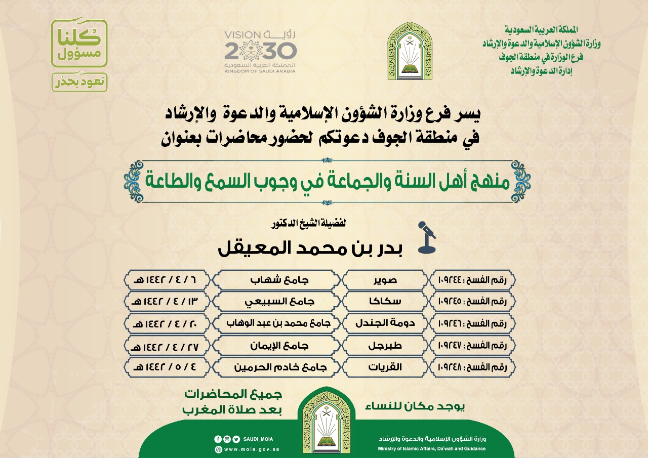يواصل فرع وزارة الشؤون الإسلامية والدعوة والإرشاد بمنطقة الجوف، تنظيم عدداً من المحاضرات الدعوية خلال شهر ربيع الأول الجاري، وتستمر حتى شهر الثالث عشر من شهر جمادى الأولى القادم 1442هـ، يلقيها دعاة الفرع في عدد من جوامع المنطقة.. حيث يلقي الشيخ بدر بن محمد المعيقل محاضرة بعنوان: (منهج أهل السنة والجماعة في وجوب السمع والطاعة) في اليوم العشرين والسابع والعشرين من الشهر الجاري في جامع محمد بن عبدالوهاب بدومة الجندل، وجامع الإيمان بطبرجل، وفي اليوم الرابع من الشهر القادم في جامع خادم الحرمين بالقريات.