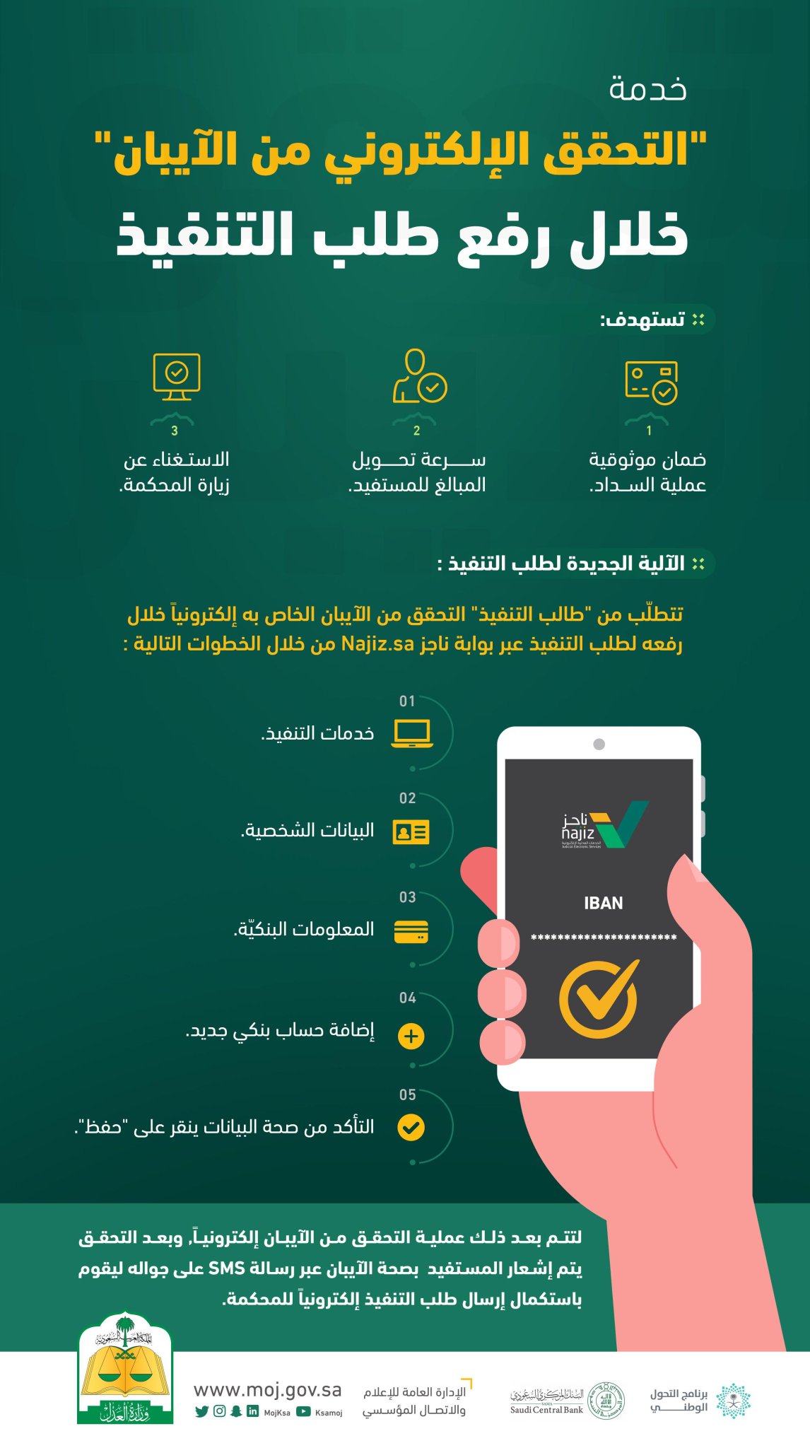 استحدثت وزارة العدل خاصية التحقق الآلي من الآيبان بالربط مع البنك المركزي السعودي , من خلال رفع طلب التنفيذ لضمان موثوقيّة وسرعة عمليات التسديد لطالبي التنفيذ دون الحاجة إلى طباعة الشيك وزيارة المحكمة لتسلّم الشيك، وذلك عبر بوابة ناجز الإلكترونية Najiz.sa للخدمات العدلية.