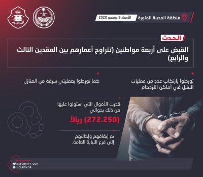 صرَّح المُتحدث الإعلامي لشرطة منطقة المدينة المنورة، المقدم حسين القحطاني، بأن المتابعة الأمنية لجرائم الاعتداء على الأموال وتعقب مرتكبيها أسفرت – بفضل الله – عن القبض على أربعة مواطنين (تتراوح أعمارهم بين العقدين الثالث والرابع)، وذلك إثر تورطهم بارتكاب عددٍ من عمليات النشل في أماكن الازدحام، بالإضافة لعمليتي سرقة من المنازل، وقدرت الأموال التي استولوا عليها من ذلك بحوالي (272.250) ريالاً، وقد جرى إيقافهم واتخاذ الإجراءات النظامية بحقهم كافة، وإحالتهم إلى فرع النيابة العامة.