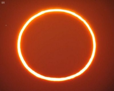 وأفاد أن المسافة بين القمر والأرض غير متساوية خلال الشهر لأن مدار القمر بيضاوي الشكل وليس دائري، وعند الكسوف الكلي يتطابق الحجم الظاهري للقمر مع مثيله للشمس بينما عند الكسوف الحلقي يظهر القمر أصغر حجماً وتظهر الشمس على شكل حلقة مضيئة محيطة بالقمر.