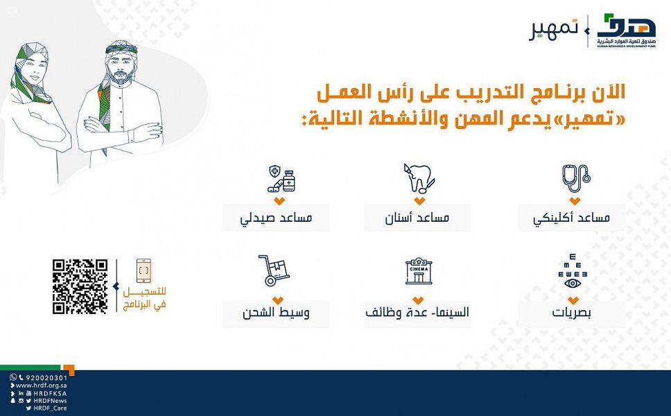 وتتضمن المهن المضافة إلى برنامج “تمهير”، مساعد إكلينيكي، ومساعد أسنان، ومساعد صيدلي، ومهن البصريات، بالإضافة إلى التدريب على بعض المهن المرتبطة بالمجال السينمائي، ووسيط الشحن البريدي.