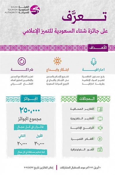 يذكر أن الهيئة السعودية للسياحة قد أعلنت عن إطلاق موسم “جائزة شتاء السعودية للتميز الإعلامي” تحت شعار”الشتاء حولك”، وذلك خلال الفترة من 10 ديسمبر 2020 وحتى نهاية مارس 2021، في أكثر من 17 وجهة سياحية حول المملكة، ويحتوي على أكثر من 300 تجربة وباقة سياحية تقدمها أكثر من 200 منشأة عاملة في القطاع السياحي، بهدف استمتاع العوائل والمجموعات والأفراد من المواطنين والمقيمين، وضيوف المملكة من مواطني دول مجلس التعاون الخليجي؛ بالأجواء الشتوية الرائعة والعروض والباقات والأنشطة والتجارب السياحية المميزة، واكتشاف ما تحويه مناطق المملكة من تنوع مناخي وبيئي، وعمق حضاري وثقافي وتاريخي.