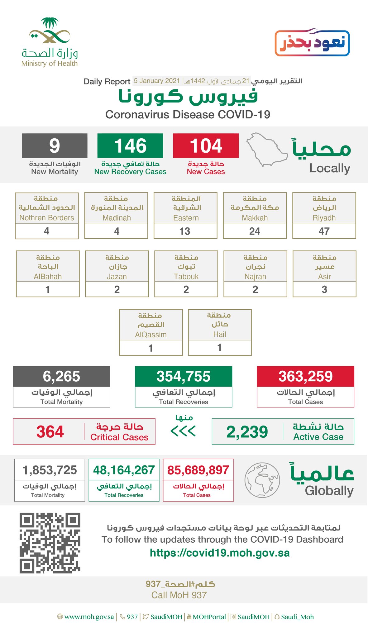وكشفت الوزارة أن عدد الحالات النشطة بلغ (2239) والحالات الحرجة ( 364) حالة.