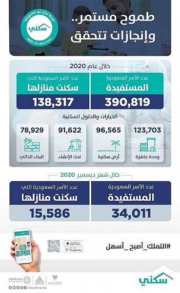 وقال معاليه في بيان صحفي: “رغم الظروف الاستثنائية التي شهدها قطاع الإسكان خلال 2020 إلا أننا تمكّنا من تحقيق منجزات عدة سطرت قصة نجاح غير مسبوقة، كان من ثمارها خدمة أكثر من 390 ألف أسرة من أهالينا ضمن خيارات برنامج سكني بينها 138 ألف أسرة سكنت منازلها على مستوى مناطق المملكة كافة”، معرباً عن فخره بما تحقق من نتائج تجاوزت المستهدفات ضمن شراكة وطنية مثمّرة بين القطاع العام والخاص من مطوّرين ومموّلين، مقدماً شكره لجميع شركاء النجاح وللعاملين في منظومة الإسكان على جهودهم وتعاونهم.