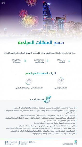 أطلقت الهيئة العامة للإحصاء (GASTAT) مشروع مسح المنشآت السياحية 2019م، وهو مسح اقتصادي سنوي شامل تقدمه الهيئة العامة للإحصاء حول قطاع السياحة في المملكة.
