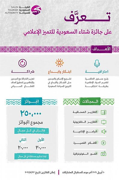 يذكر أن الهيئة السعودية للسياحة المسؤول الرسمي عن الهوية الوطنية للسياحة (روح السعودية)، أعلنت عن جائزة “شتاء السعودية للتميز الإعلامي”، وهي إحدى مبادرات موسم “الشتاء حولك”، بمجموع جوائز تصل إلى 250 ألف ريال، في خمسة مجالات متنوعة هي: التقارير الصحفية، والتقارير التلفزيونية، والبرامج الإذاعية، والصور الفوتوغرافية، والأفلام القصيرة”، وتتمثل أهدافها الرئيسية في رفع مستوى احترافية تقديم المواد الإعلامية، والتشجيع على الإبداع والابتكار في الترويج للسياحة السعودية، وتعزيز الشراكة مع المبدعين والإعلاميين لتحقيق أهداف الموسم، ضمن آلية تشمل فائزين اثنين في كل مجال، يُعتمدون من لجنة متخصصة في التقييم، ويمكن للراغبين إرسال أعمالهم وإبداعاتهم عبر البريد الإلكتروني media.award@sta.gov.sa علمًا بأن 10 أبريل المقبل هو آخر موعد لقبول المشاركات، على أن يعلن عن الفائزين في حساب الهيئة السعودية للسياحة على تويتر (SaudiTourism@) في السادس عشر من مايو المقبل.