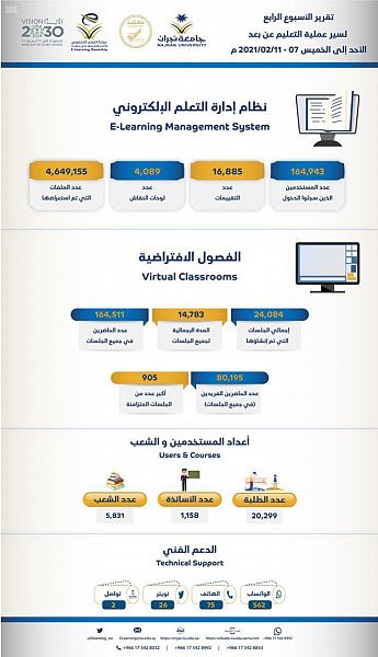 قدم نظام التعليم – عن بُعد – بجامعة نجران في أسبوعه الرابع من الفصل الدراسي الحالي خدماته لـ 164.943 مستخدماً خلال الفترة من 7 – 11 فبراير الجاري.