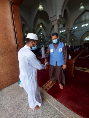 كما شارك في تطبيق الإجراءات الاحترازية كوكبة من الدعاة الغير ناطقين باللغة العربية من مكاتب توعية الجاليات والجمعيات الدعوية والتي يزيد عددها على 420 مكتباً بمختلف مناطق المملكة والذين تمثلت جهودهم في تقديم النصائح والإرشادات وبلغات عالمية للجاليات بالتأكيد على ضرورة تطبيق إجراءات التباعد الاجتماعي،ولبس الكمامات، وإحضار السجادات، كما شاركت الفرق التطوعية بالجمعيات الرسمية بإجراء عمل فحص الحرارة وتوزيع المعقمات، والمشاركة في ترتيب دخول وخروج المصلين لمنع التزاحم.