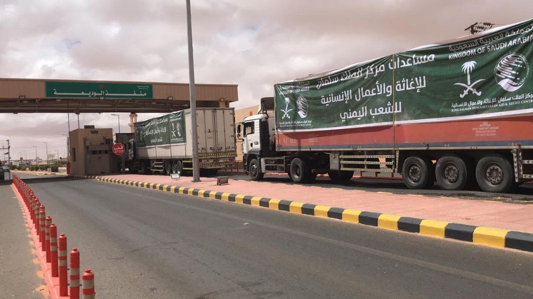 عبور 18 شاحنة مقدمة من مركز الملك سلمان للإغاثة منفذ الوديعة متوجهة لعدة محافظات في اليمن