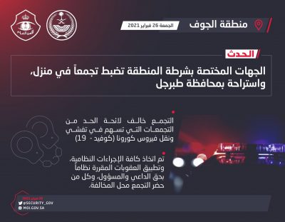 صرح المتحدث الرسمي لشرطة منطقة الجوف العقيد يزيد النومس، بأن الجهات المختصة بشرطة المنطقة ضبطت تجمعاً في منزل، واستراحة بمحافظة طبرجل، مخالفاً للائحة الحد من التجمعات التي تسهم في تفشي ونقل فيروس كورونا (كوفيد -19 )، وقد تم اتخاذ الإجراءات النظامية كافة، وتطبيق العقوبات المقررة نظاماً بحق الداعي والمسؤول وكل من حضر التجمع محل المخالفة.