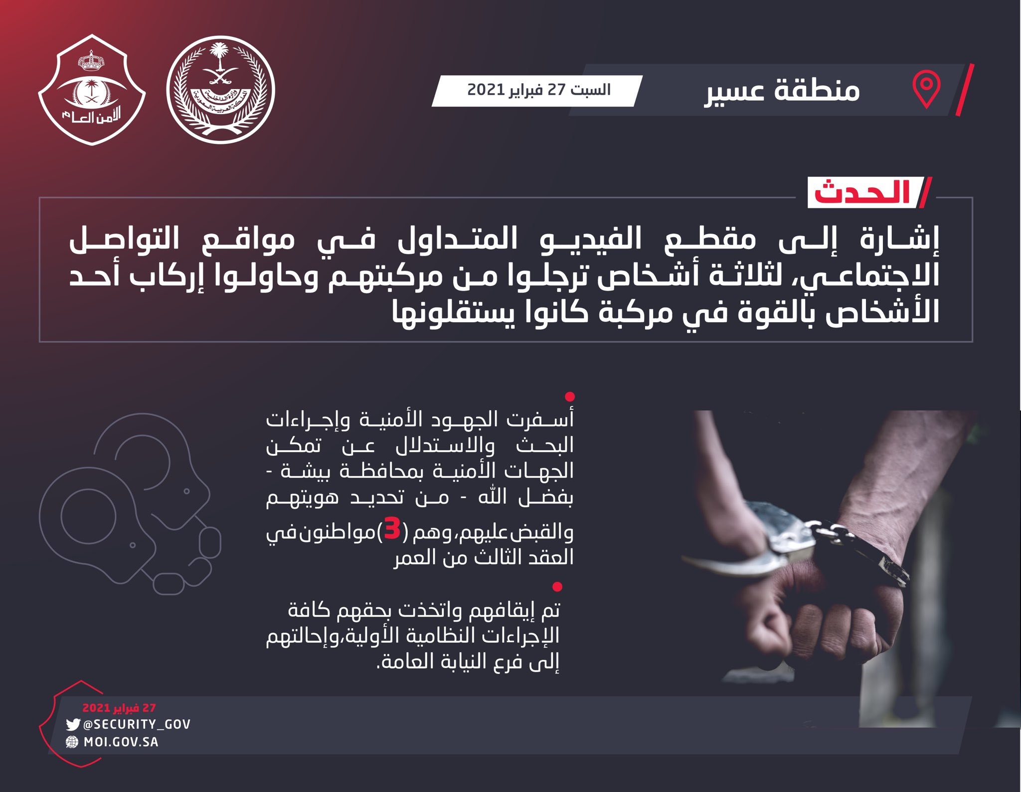 صرّح المُتحدث الإعلامي لشرطة منطقة عسير المقدم زيد الدباش، بأنه إشارة إلى مقطع الفيديو المتداول في مواقع التواصل الاجتماعي، لثلاثة أشخاص ترجلوا من مركبتهم وحاولوا إركاب أحد الأشخاص بالقوة في مركبة كانوا يستقلونها، فقد أسفرت الجهود الأمنية وإجراءات البحث والاستدلال عن تمكن الجهات الأمنية بمحافظة بيشة ـ بفضل الله ـ من تحديد هويتهم والقبض عليهم، وهم (3) مواطنون في العقد الثالث من العمر، وجرى إيقافهم واتخذت بحقهم الإجراءات النظامية الأولية كافة، وإحالتهم إلى فرع النيابة العامة.