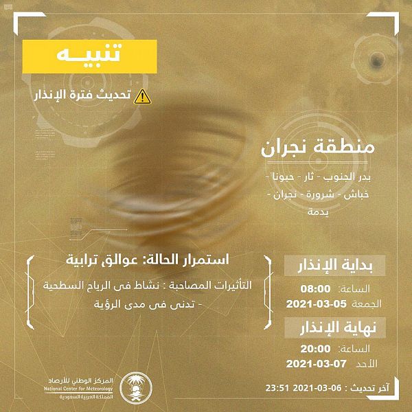نبّه المركز الوطني للأرصاد اليوم، من عوالق ترابية، تؤدي إلى تدنٍ في مدى الرؤية على منطقة نجران، تشمل مدينة نجران، ومحافظات شرورة، وبدر الجنوب، وحبونا، وثار، ويدمة، وخباش.