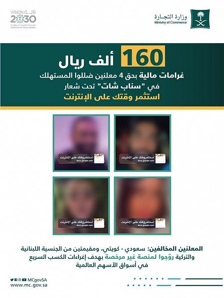 أعلنت وزارة التجارة عن معاقبة أربعة معلنين، مواطن سعودي وكويتي، ومقيمتين من الجنسية اللبنانية والجنسية التركية، خالفوا نظام التجارة الإلكترونية بالإعلان والترويج لنشاط “الفوركس” غير المرخّص عبر “سناب شات” وتضليل المستهلكين تحت شعار “استثمر وقتك على الإنترنت” التي تندرج ضمن أنشطة إغراءات الكسب السريع غير المشروعة.