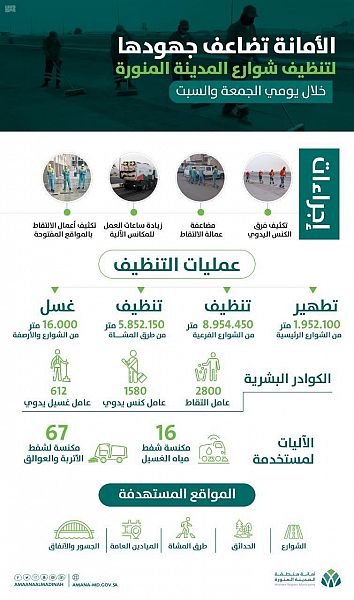 واستهدفت تلك الأعمال تنظيف الشوارع والحدائق وطرق المشاة والميادين العامة والجسور والأنفاق في جميع المحاور الأربعة بالمدينة المنورة وهي المحور الشمالي والجنوبي والشرقي والغربي ، في حين شارك في تلك الجهود من فرق الأمانة 1609 عاملي التقاط و1084 عامل كنس يدوي و612 عامل غسيل يدوي ، كما تم استخدام 16 مكنسة لشفط مياه الغسيل و67 مكنسة لشفط الأتربة والعوالق.