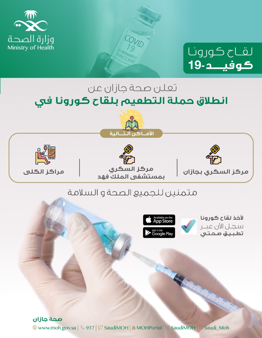 أعلنت صحة جازان عن انطلاق حملة التطعيم بلقاح كورونا في ثلاث مراكز بالمنطقة وهي كالتالي : مركز السكري بجازان ، ومركز السكري ، بمستشفى الملك فهد المركزي ، ومراكز الكلى وإمكانية الحجز مباشرة حسب المواعيد المتاحة.