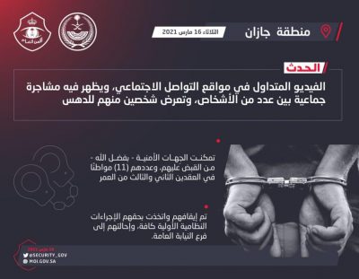 صرح المتحدث الإعلامي لشرطة منطقة جازان الرائد نايف الحكمي، بأنه إشارة إلى الفيديو المتداول في مواقع التواصل الاجتماعي، ويظهر فيه مشاجرة جماعية بين عدد من الأشخاص، وتعرض شخصين منهم للدهس، فقد تمكنت الجهات الأمنية – بفضل الله – من القبض عليهم، وعددهم (11) مواطنًا في العقدين الثاني والثالث من العمر، وجرى إيقافهم واتخذت بحقهم الإجراءات النظامية الأولية كافة، وإحالتهم إلى فرع النيابة العامة بالمنطقة.