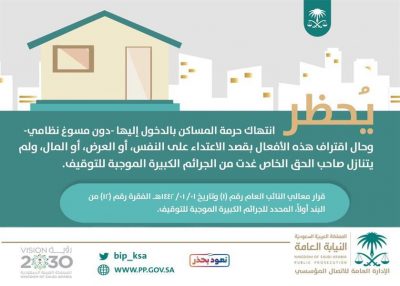 أعلنت النيابة العامة، اليوم (الثلاثاء)، أنه لا يجوز انتهاك حرمة المساكن بالدخول إليها، إلا في الحالات التي بيّنها النظام.