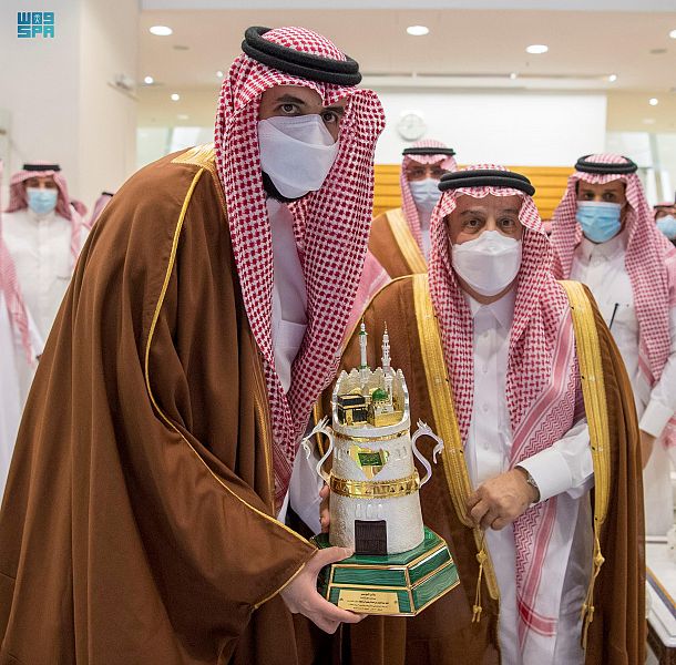 وسلم الأمير فيصل بن بندر الكأس للأمير سعود بن سلمان مقدماً له التهنئة بهذا الإنجاز.