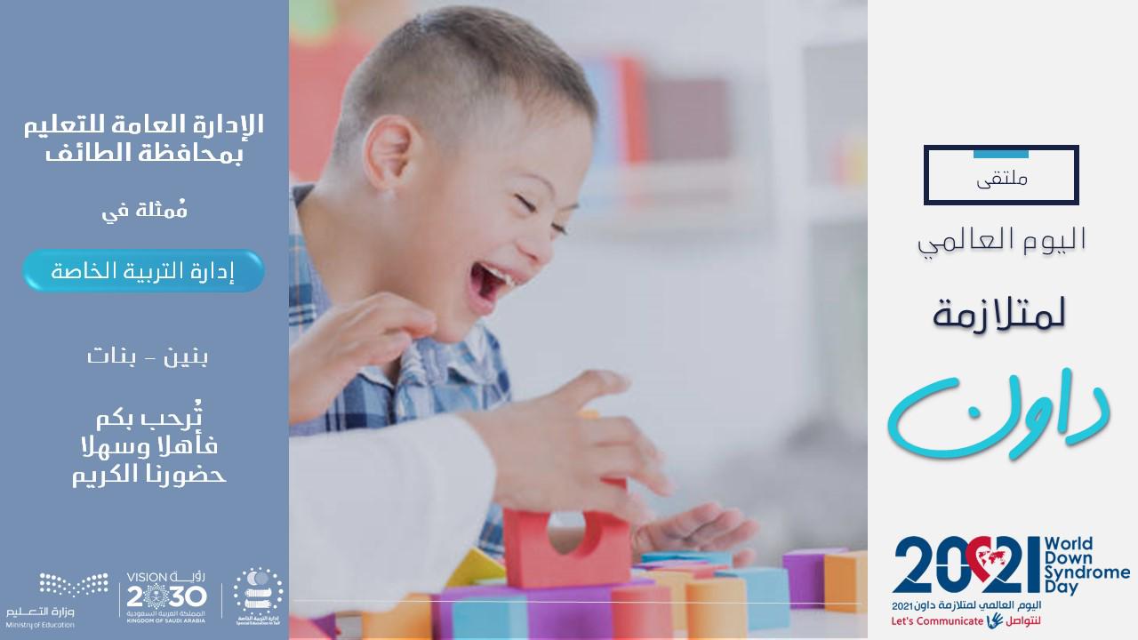 أكد المدير العام للتعليم في محافظة الطائف طلال بن مبارك اللهيبي على أهمية اليوم العالمي لمتلازمة داون 2021، من كل عام والذي يتم فيه تسليط الضوء على دعم هذه الفئة الغالية وتوعية المجتمع بضرورة اندماجهم بالمجتمع بشكل أكبر وتعزيز ثقتهم بأنفسهم والتعرف على احتياجاتهم، مؤكداً بأن هذه الفئة لا تختلف كثيرا عن أقرانهم وهم يستطيعون أن يقدمون الكثير في مجتمعهم والكثير من المهارات المتنوعة ويندمجون مع المجتمع. وشدد اللهيبي خلال افتتاحه ملتقى اليوم العالمي لمتلازمة داون والذي نظمته إدارتا التربية الخاصة للبنين والبنات بحضور مساعديه للشؤون التعليمية بنين وبنات وعدد من القيادات التعليمية على أهمية نشر التوعية والتثقيف بذوي متلازمة داون وغيرهم من ذوي الإعاقة بين التربويين خصوصاً وأفراد المجتمع بصورة عامة.وقال أن تعليم الطائف حرص على المشاركة في هذه الفعالية العالمية من خلال الملتقى الذي نظمته إدارتا التربية الخاصة للبنين والبنات هذا الملتقي والذي يشارك فيه نخبة من المتحدثين المميزين في مجال التربية الخاصة وتنطلق فعالياته اليوم عبر نظام الزووم. وقدم اللهيبي شكره وتقديره لمساعديه للشؤون التعليمية بنين وبنات، ولمدير إدارة التربية الخاصة بنين ومديرة التربية الخاصة بنات ومنسوبيهم على الإعداد والتجهيز لهذا الملتقى الهام.