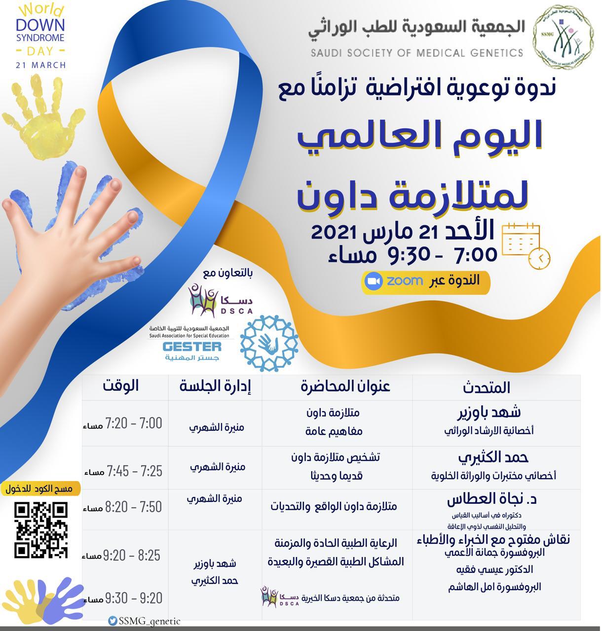 تنظم الجمعية السعودية للطب الوراثي عن بعد في تمام الساعة السابعة من مساء اليوم الأحد الندوة التوعوية الافتراضية التي تتزامن مع اليوم العالمي لمتلازمة داون . وتقام هذه الندوة بالتعاون مع الجمعية السعودية للتربية الخاصة (جستر)