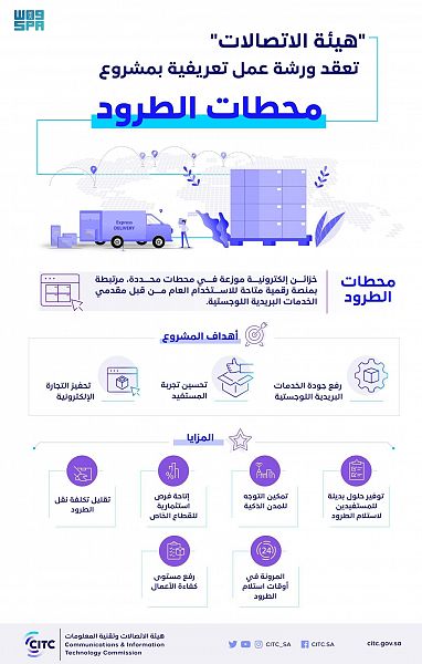 عقدت هيئة الاتصالات وتقنية المعلومات، ورشة عمل افتراضية للتعريف بمشروع محطات الطرود، بحضور عدد من مقدمي الخدمات البريدية اللوجستية والمتاجر الإلكترونية، بالإضافة إلى عدد من المهتمين بالاستثمار في تلك الخدمات الحيوية.