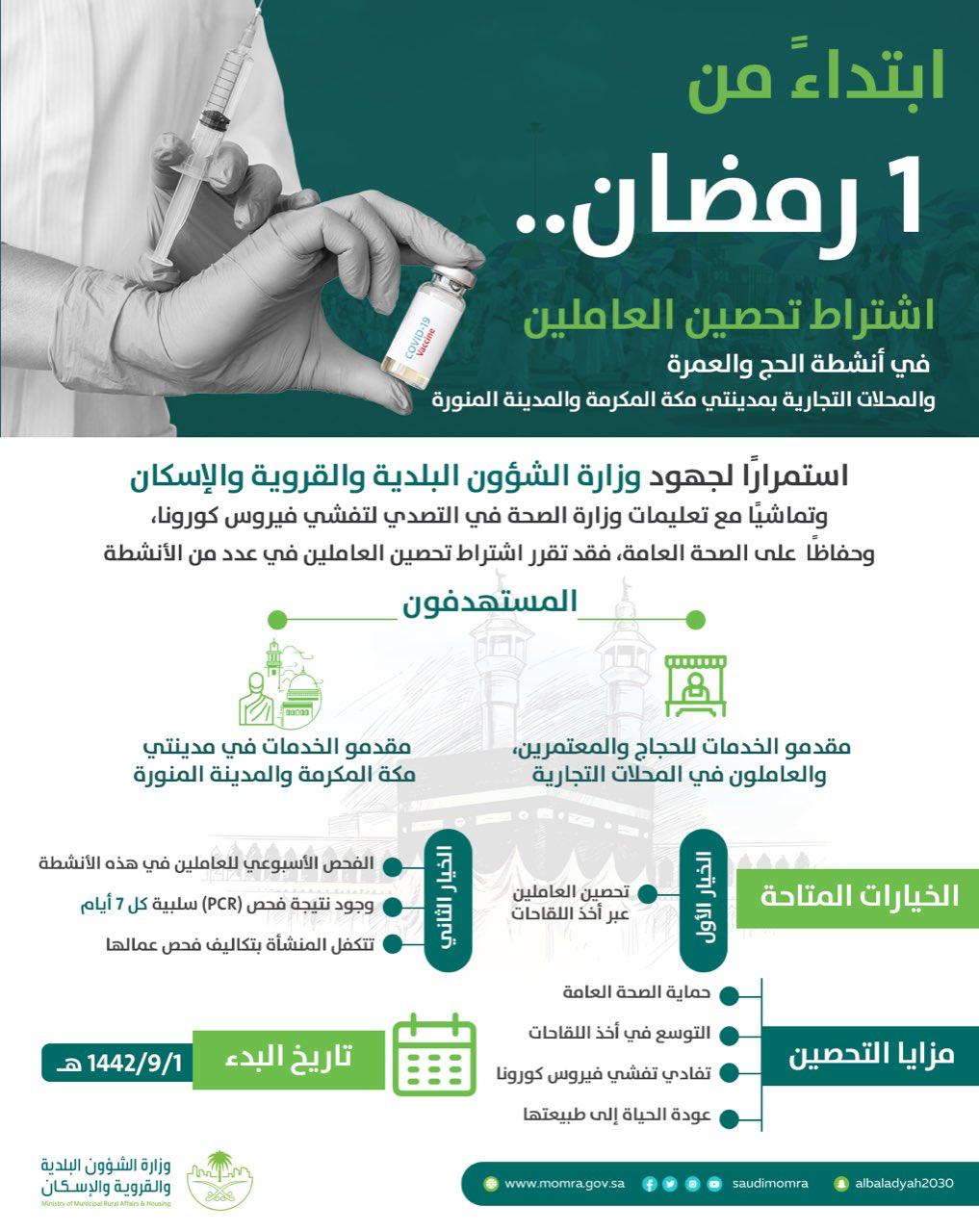 قررت وزارة الشؤون البلدية والقروية والإسكان اشتراط تحصين العاملين في أنشطة الحج والعمرة، والمحلات التجارية في مدينتي مكة المكرمة والمدينة المنورة، بدءًا من 1 رمضان القادم؛ وذلك حمايةً للصحة العامة، وتوسعًا في أخذ اللقاحات.