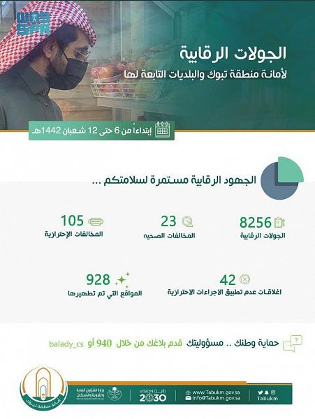 نفَّذت أمانة منطقة تبوك والبلديات التابعة لها خلال الأسبوع الماضي 8256 جولة رقابية على المنشآت التجارية للتأكد من مدى التزامها بالإجراءات الاحترازية والوقائية، أسفرت عن إغلاق (42) منشأة لعدم الالتزام بالإجراءات الاحترازية, وإصدار (127) مخالفة لمنشآت مخالفة للإجراءات الرقابية الصحية والاحترازية.