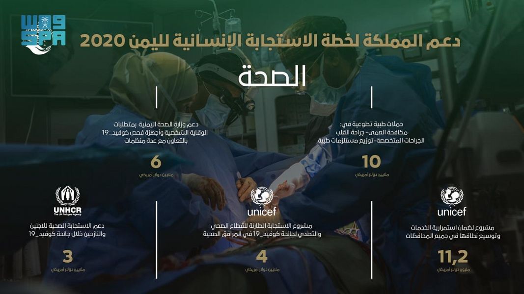 كما قدم مركز الملك سلمان للإغاثة دعماً للاستجابة الصحية للاجئين والنازحين خلال جائحة كورونا ليستفيد منها 371,950 فرداً، في محافظات عدن – لحج – حضرموت – الحديدة، بالتعاون مع المفوضية السامية للأمم المتحدة لشؤون اللاجئين بقيمة 3 ملايين دولار.