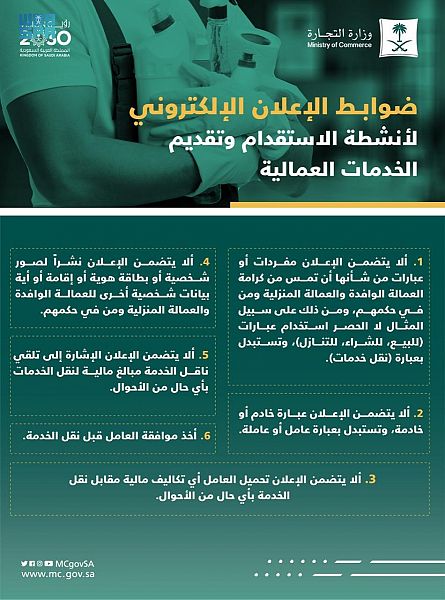 شددت وزارة التجارة على أهمية الالتزام بالضوابط المنظمة للإعلان عن أنشطة الاستقدام وتقديم الخدمات العمالية الصادرة من وزارة المواد البشرية والتنمية الاجتماعية، وفق ما نصت عليه الأنظمة المتعلقة بحقوق الإنسان، وقواعد ممارسة نشاط الاستقدام وتقديم الخدمات العمالية لدى الوزارة وذلك عند القيام بأي إعلان عن أنشطة الاستقدام وتقديم الخدمات العمالية.