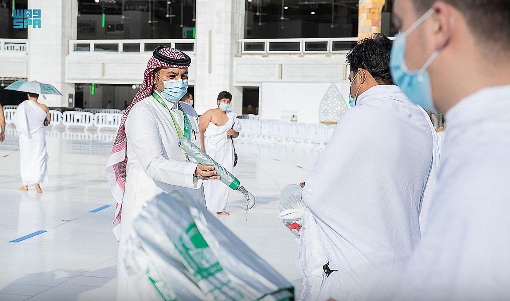شؤون الحرمين توزع عدد من المظلات على المعتمرين