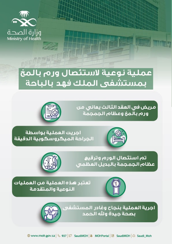 تمكّن فريق طبي متخصص بمستشفى الملك فهد بالباحة من إجراء عملية ناجحة لإستئصال ورم بالمخ وعظام الجمجمة لمريض ، حيث تُعتبر هذه العملية من العمليات النوعية والمتقدمة بواسطة الجراحة الميكروسكوبية الدقيقة وترقيع لعظام الجمجمة بواسطة البديل العظمي وقد تم وضع المريض بالتنويم لمتابعة حالته والإطمئنان عليه لمدة 3 أيام حتى تماثل للشفاء وغادر المستشفى بصحة جيدة ولله الحمد