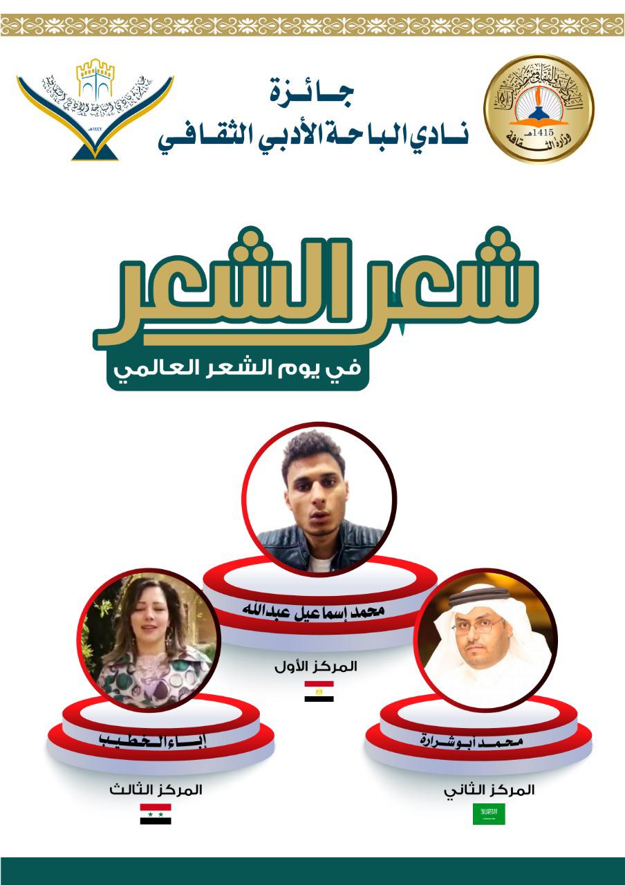 أعلن نادي الباحة الأدبي الثقافي أسماء الفائزين بجائزته التي أطلقها في يوم الشعر العالمي تحت عنوان *( شعر الشعر )* وقد بلغ عدد المتسابقين (351) شاعرا وشاعرة من 15 دولة هي : السعودية ، مصر ، العراق ، موريتانيا ، لبنان ، سوريا ، السنغال ، المغرب ، اليمن ، الجزائر ، البحرين ، غامبيا ، الأردن ، السودان ، فلسطين .