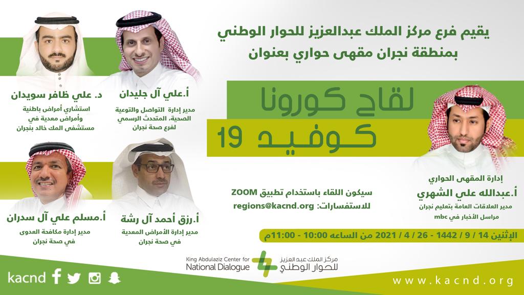 نفّذ مركز الملك عبد العزيز للحوار الوطني بمنطقة نجران، مقهى حوارياً عن بُعد بعنوان: “لقاح كورونا كوفيد 19 ” استضاف خلاله الاستاذ: علي آل جليدان، مدير إدارة التواصل والتوعية الصحية، المتحدث الرسمي لفرع صحة نجران، والدكتور علي ظافر سويدان استشاري أمراض باطنية وأمراض معدية في مستشفى الملك خالد بنجران، والاستاذ : رزق أحمد آل رشة، مدير إدارة الامراض المعدية في صحة نجران، والاستاذ: مسلم على آل سدران، مدير إدارة مكافحة العدوى في صحة نجران.