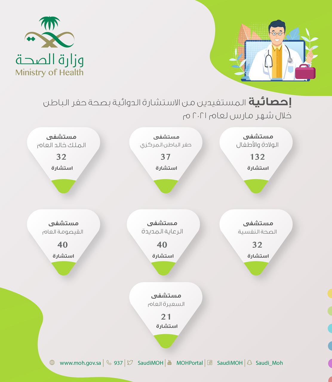 قدمت صحة حفر الباطن ممثلة بمستشفياتها خدمة الاستشارات الدوائية لـ262 مستفيداً خلال شهر مارس لعام 2021 ، إذا بلغت عدد الاستشارات الدوائية بمستشفى الولادة والأطفال 132 استشارة ، فيما بلغ عدد الاستشارات الدوائية بمستشفى حفر الباطن المركزي 37 استشارة ، لتصل عدد الاستشارات بمستشفى السعيرة 21 استشارة ، فيما تخطت عدد الاستشارات الدوائية بمستشفى القيصومة العام ومستشفى الرعاية المديدة 40 استشارة ، ليبلغ عدد الاستشارات الدوائية بمستشفى الملك خالد العام ومستشفى الصحة النفسية 32 استشارة دوائية .
