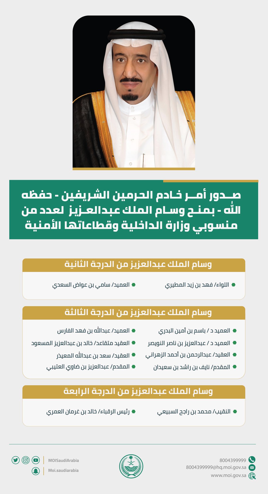 أمر خادم الحرمين الشريفين الملك سلمان بن عبدالعزيز آل سعود – حفظه الله – بمنح وسام الملك عبدالعزيز، لعدد من منسوبي وزارة الداخلية وقطاعاتها الأمنية، من الدرجات الثانية والثالثة والرابعة.