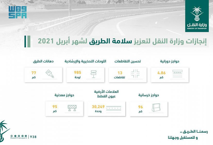 نفذت وزارة النقل خلال شهر أبريل الماضي، عددًا من الأعمال والمشروعات على الطرق التابعة لها في مناطق المملكة، بهدف رفع مستوى السلامة عليها، وذلك من خلال فحص وتحديد الاحتياجات وفق العديد من الإجراءات والدراسات والاختبارات.