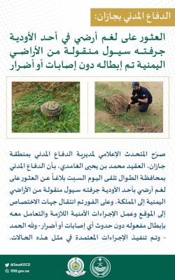 مدني جازان : العثور على لغم أرضي في أحد الأودية جرفته سيول منقولة من الأراضي اليمنية تم إبطاله دون إصابات أو أضرار