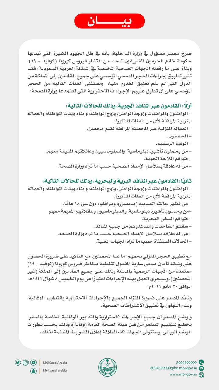 مصدر مسؤول بوزارة الداخلية: تَقَرّرَ تطبيق إجراءات الحجر الصحي المؤسسي على جميع القادمين إلى المملكة من الدول التي لم يتم تعليق القدوم منها