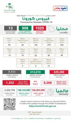 أعلنت وزارة الصحة تسجيل 1020 إصابة جديدة بفيروس كورونا المستجد “كوفيد 19” في السعودية ليصل إجمالي الحالات إلى 429,389.