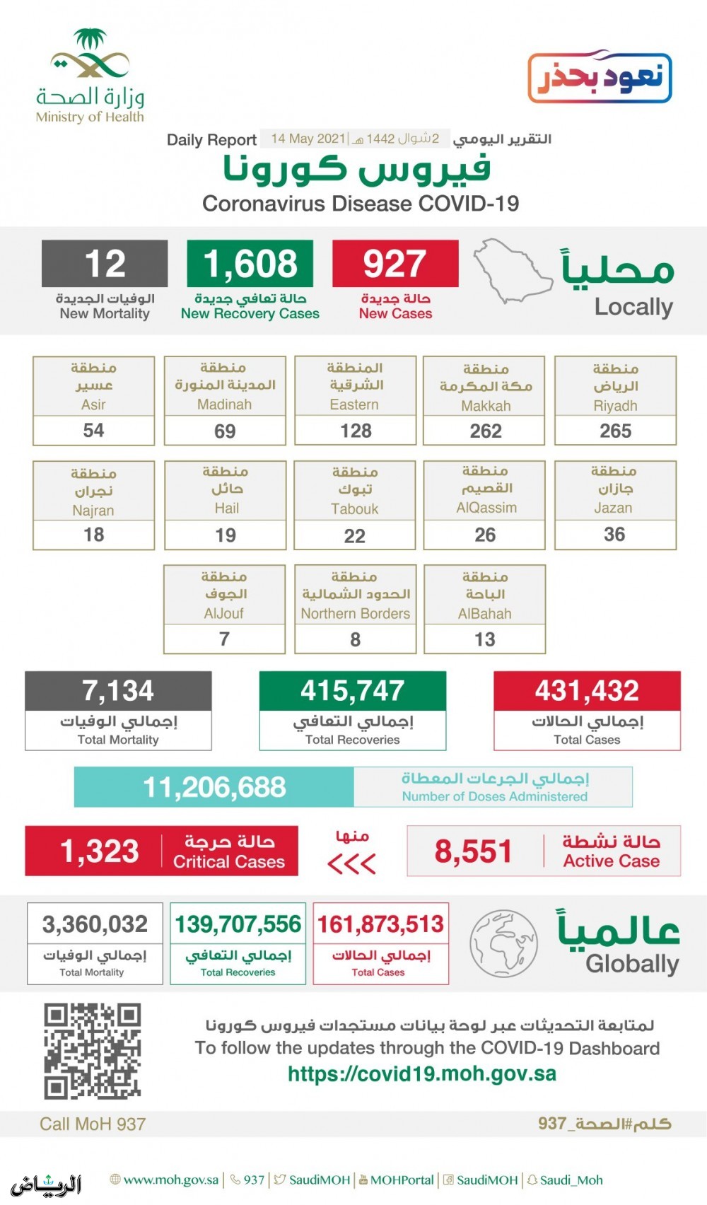 ويوضح الجدول المرفق توزيع الحالات الجديدة في مدن المملكة، وكذلك أعداد الإصابة والتعافي والوفيات عالمياً.