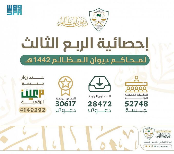 أظهر التقرير الإحصائي بمنصة معين الرقمية بديوان المظالم نتائجه ومؤشراته القضائية للربع الثالث من العام الهجري 1442هـ لعموم المحاكم، إذ بلغت الدعاوى الواردة بكافة المحاكم 28472 دعوى، بينما بلغت الدعاوى المنجزة 30617 دعوى بعدد جلسات 52748 جلسة، وذلك استمرارًا للجهود التي يبذلها مرفق القضاء الإداري بهدف الاستفادة من خدماته الرقمية عن بعد، وتيسيرًا على المستفيدين في إتمام جميع مراحل الدعوى بشكلٍ رقمي متكامل .