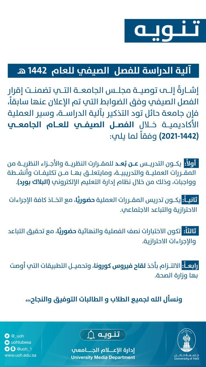 أعلنت جامعة حائل عن آلية الدراسة، واستعدادها التام لبدء سير العملية الأكاديمية خلال الفصل الصيفي للعام الجامعي “1442 هـ” الذي إنطلق هذا اليوم، مع اتخاذ كافة الإجراءات الاحترازية للحفاظ على سلامة الجميع.