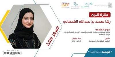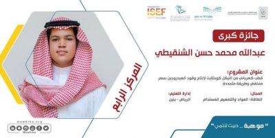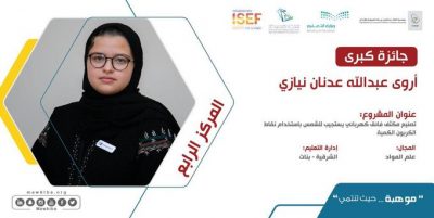 وحقق الجوائز الكبرى كل من: الطالب منصور المرزوقي بفوزه بالمركز الثاني في مجال الطاقة: المواد والتصميم المستدام عن مشروعه ” تصميم مكثف كهربائي فائق يشحن نفسه بوسيلة الضوء”، وجاءت الطالبة رشا القحطاني في المركز الثالث في مجال العلوم الاجتماعية والسلوكية عن مشروعها “خاصية لعبة فيديو مبتكرة للتشخيص النفسي لاضطراب القلق العام في مرحلة المراهقة”، والطالبة لانا أبو جامل حققت المركز الرابع في مجال علم الأحياء الحسابي والمعلوماتي عن مشروعها ” التنبؤ الحاسوبي لقابلية استخدام مركب خاص كمثبط لفيروس SARS-CoV-2 بأقل أضرار جانبية”، والطالب عبدالله الشنقيطي بجائزة المركز الرابع في مجال الطاقة: المواد والتصميم المستدام عن مشروعه ” قطب كهربائي من النيكل كوبالتايت لإنتاج وقود الهيدروجين بسعر منخفض وطريقة متجددة”، والطالبة أروى نيازي بجائزة المركز الرابع في مجال علم المواد عن مشروعها تصنيع مكثف فائق يستجيب للشمس باستخدام نقاط الكربون الكمية.