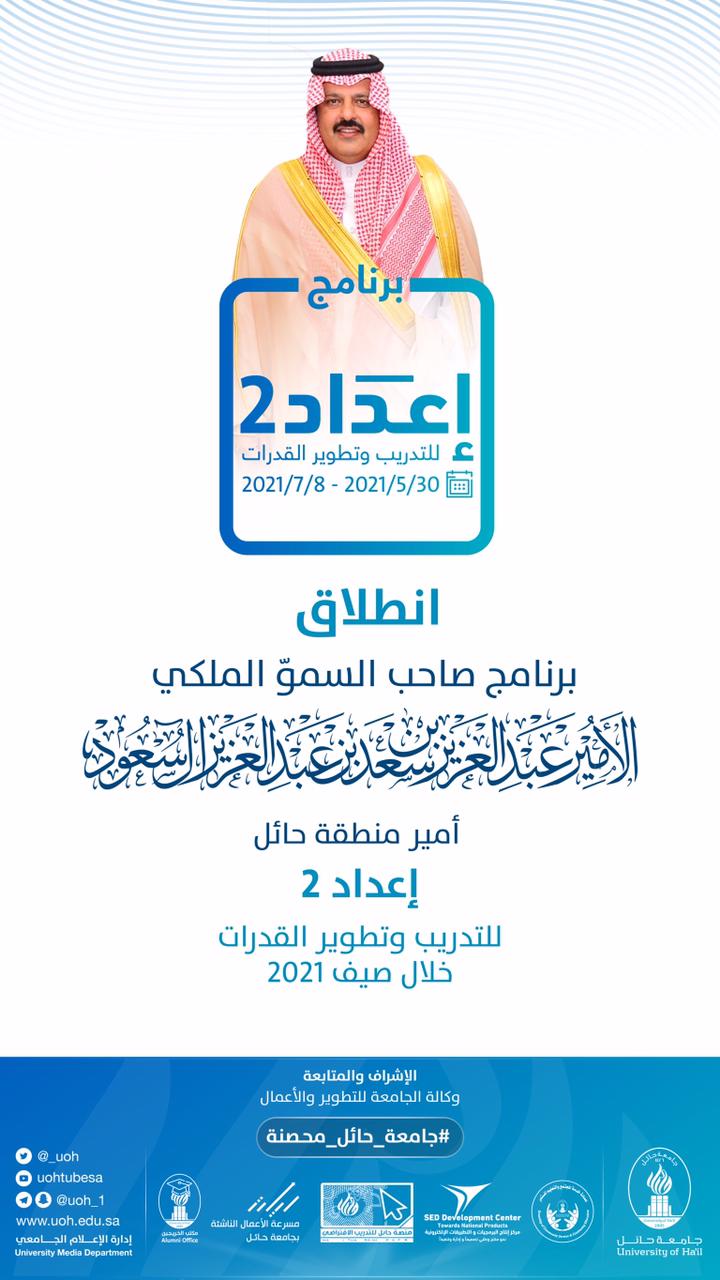 أطلقت جامعة حائل اليوم النسخة الثانية من برنامج صاحب السموّ الملكي الأمير عبدالعزيز بن سعد بن عبدالعزيز، أمير منطقة حائل، للتدريب وتطوير القدرات (إعداد٢)، الذي تُنفذ برامجه التدريبية خلال صيف هذا العام ٢٠٢١م، في خمسة مسارات رئيسة، تشمل الأسرة والمجتمع، والإعداد الجامعي لطلبة المرحلة الثانوية، والطريق إلى سوق العمل، وتأهيل الطلاب المقبلين على الدراسات العليا، وريادة الأعمال والمشروعات التنموية.