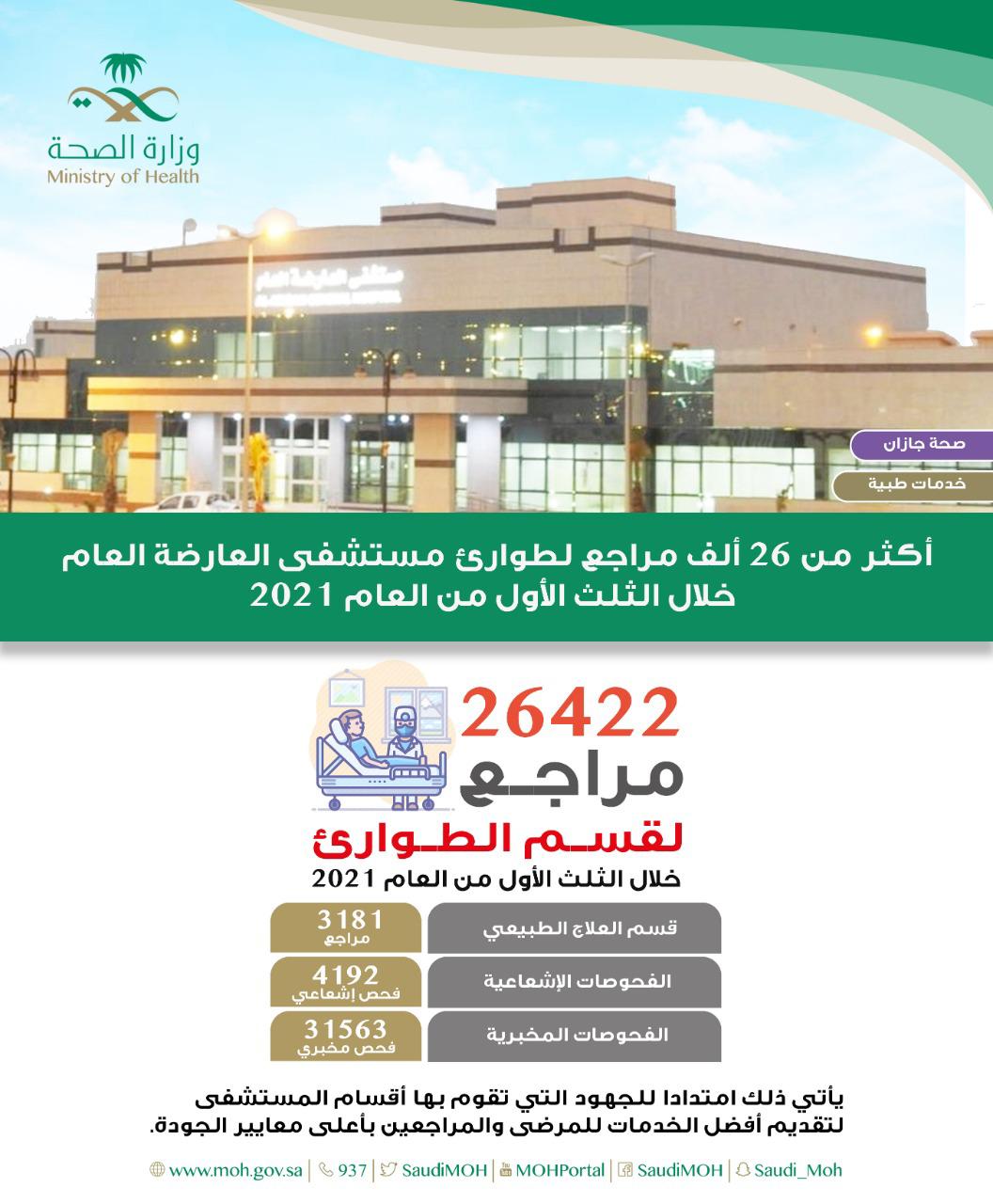 أستقبل قسم الطوارئ بمستشفى العارضة العام 26422 مراجع خلال الثلث الأول من العام الميلادي 2021.
