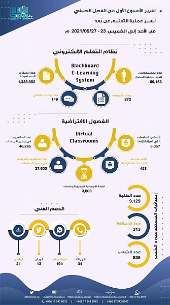 واستعرض التقرير تفاصيل 6.057 فصلاً افتراضياً، منها 453 جلسة متزامنة، وبلغ عدد الحاضرين الفرديين من خلالها 27.603، فيما بلغ عدد الحضور لجميع الجلسات 46.285 ، ووصل عدد الشُعب إلى 835 شُعبة، أدارها 313 أستاذاً، بحضور 9.129 طالباً.