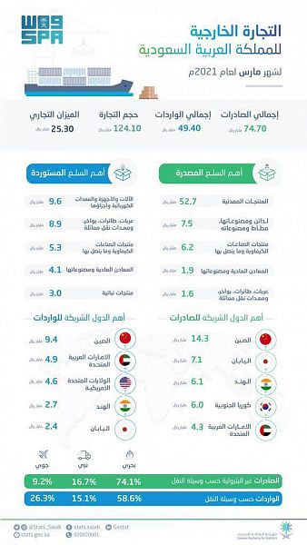 ووفق بيانات الهيئة العامة للإحصاء ارتفعت نسبة الصادرات البترولية من مجموع الصادرات الكلي من 65.6% في شهر مارس 2020م إلى 70 % في شهر مارس 2021م، بينما ارتفعت قيمة الصادرات السلعيَّة بالمقارنة مع الشهر السابق فبراير 2021م بمقدار 8.9 مليار ريال وبنسبة 13.6%.