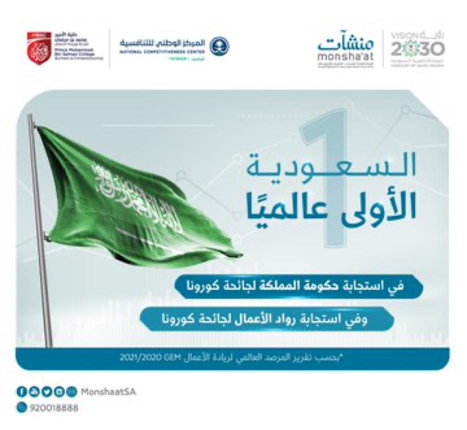 حققت المملكة العربية السعودية المركز الأول عالميًا في “استجابة الحكومة لجائحة كورونا”، و”استجابة رواد الأعمال لجائحة كورونا”، فيما تقدمت في مؤشر حالة ريادة الأعمال إلى المركز السابع على مستوى دول العالم بعد أن كانت في المركز 17، وذلك وفقًا لتقرير المرصد العالمي لريادة الأعمال (GEM) للعام 2020/2021م الذي صدر بالتعاون مع كلية الأمير محمد بن سلمان للأعمال وريادة الأعمال ومركز بابسون العالمي لقيادة ريادة الأعمال (BGCEL).