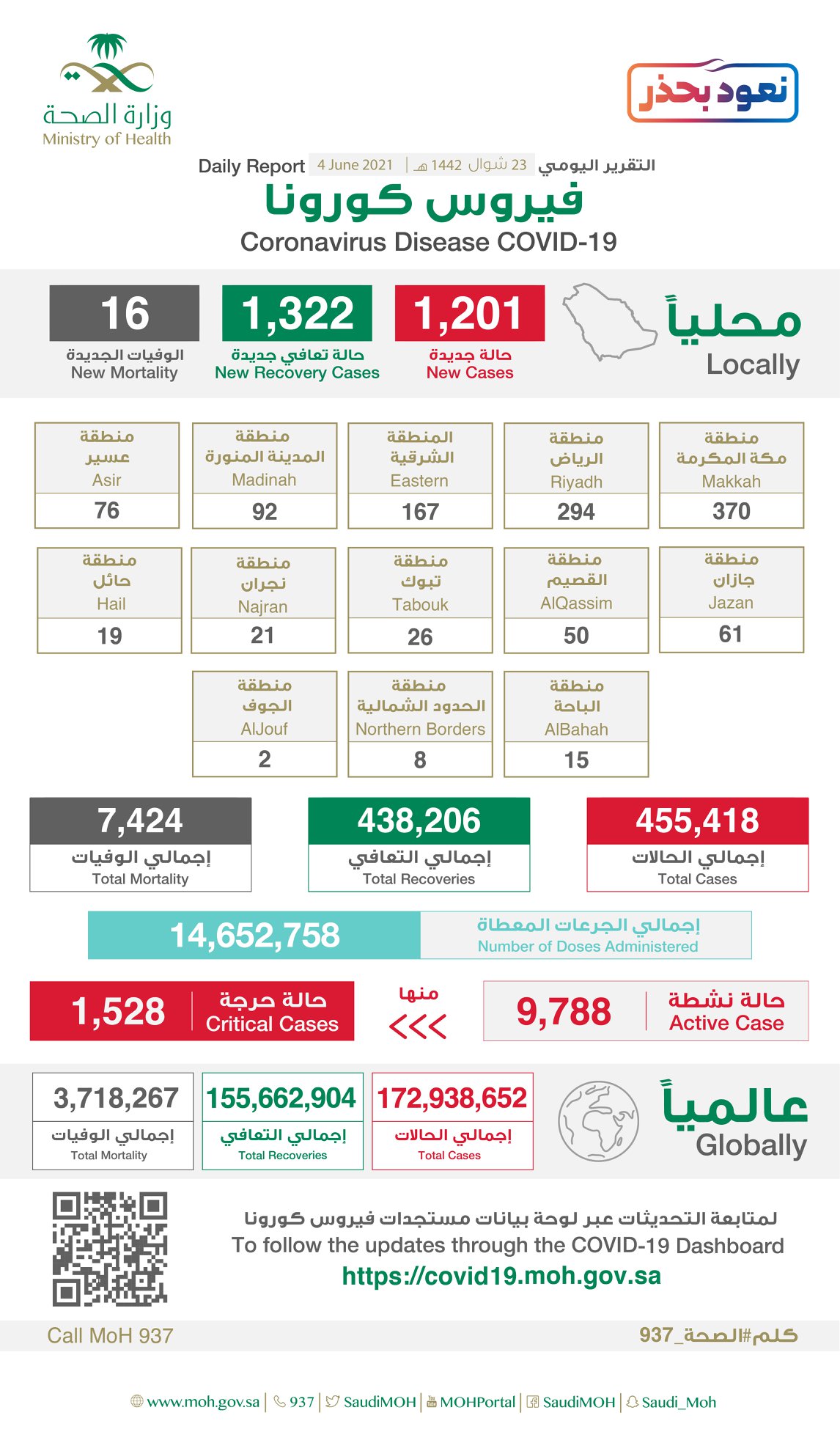 أعلنت وزارة #الصحة اليوم الجمعه عن تسجيل (1201) حالة إصابة جديدة بفيروس كورونا (كوفيد-19)، وتسجيل (16) حالات وفيات رحمهم الله، وتسجيل (1322) حالة تعافي ليصبح إجمالي عدد الحالات المتعافية (438,206) حالة ولله الحمد.
