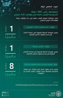 واصلت المملكة تميزها العالمي، متفوقة على 180 دولة في مؤشرين من مؤشرات الأداء البيئي لتتربع على المرتبة الأولى في مؤشر “عدم فقدان الغطاء الشجري” ومؤشر “الأرض الرطبة”، إضافة إلى تفوقها على 172 دولة في الحفاظ على البيئات الطبيعية وحمايتها ومنع انقراض الأنواع النادرة من الحيوانات، محتلة المرتبة الثامنة على مستوى العالم في “مؤشر مواطن الأجناس”.
